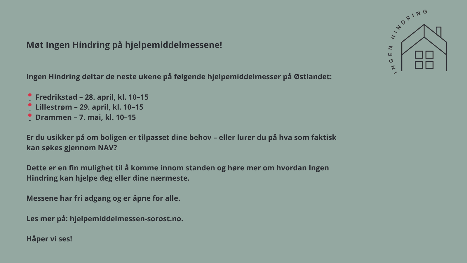 De neste ukene deltar Ingen Hindring på flere hjelpemiddelmesser på Østlandet. Kom gjerne innom, still spørsmål og få en uforpliktende prat om din situasjon.